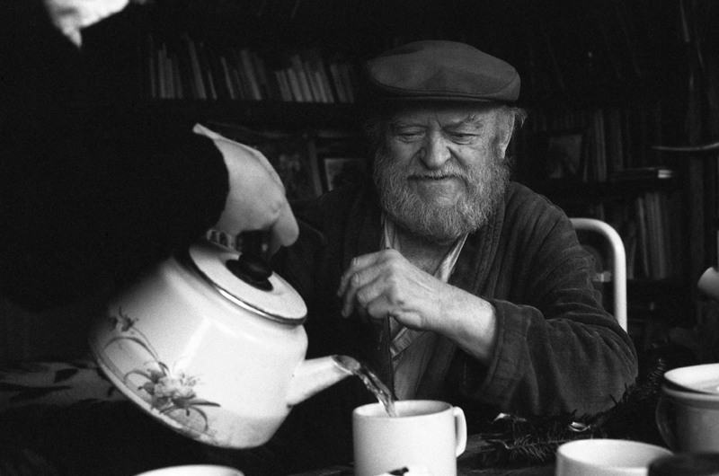 Nieporozumienie, ze stycznia 1992, dobrze wyszło fotografii. Sąsiadce z góry, w kamienicy przy Szerokiej, zwierzyłam się, że chciałabym zrobić portret Jerzego Panka. Mój ulubiony grafik mieszkał na ostatnim piętrze w jednopokojowym mieszkaniu-pracowni. O terminie nie rozmawiałyśmy. Potem dowiedziałam się, że czekał na mnie następnego dnia. Dobrą stroną „zakłóceń na łączach” był malarz z nieprzyciętą brodą i w wysłużonym swetrze, kiedy już do spotkania doszło. Pierwszy portret zrobiłam jeszcze w styczniu. Od tamtego czasu często bywałam u niego w pracowni. I zawsze był po domowemu. Jak na tym zdjęciu z czajnikiem, z 7 listopada 1998. Pan Jerzy od paru lat nie wychodził z domu. Dbali o niego przyjaciele i starzy znajomi. Ktoś wyprowadzał Pimpka. Ktoś inny robił zakupy. Bardzo lubiłam te nasze spotkania. Myślę – z wzajemnością. Odwiedziłam go z córką, kiedy, po przeprowadzce, mieszkaliśmy już przy placu Inwalidów. Ola, wtedy pięcio- sześcioletnia, doskonale pamięta to spotkanie. Jerzy Panek – stały model dla swoich prac – widział we mnie sąsiadkę z dołu. Nie fotografkę.