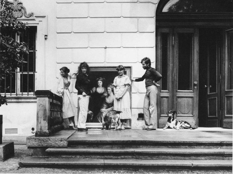 Przed pałacem w Nieborowie, druga połowa lat 70. Fot. Włodzimierz Piwkowski. Archiwum rodzinne. Stoją od lewej: Teresa Bilczewska, Flora Bieńkowska, Anna Piwkowska z psami Daganem i Benitą oraz Jan Prokopowicz.