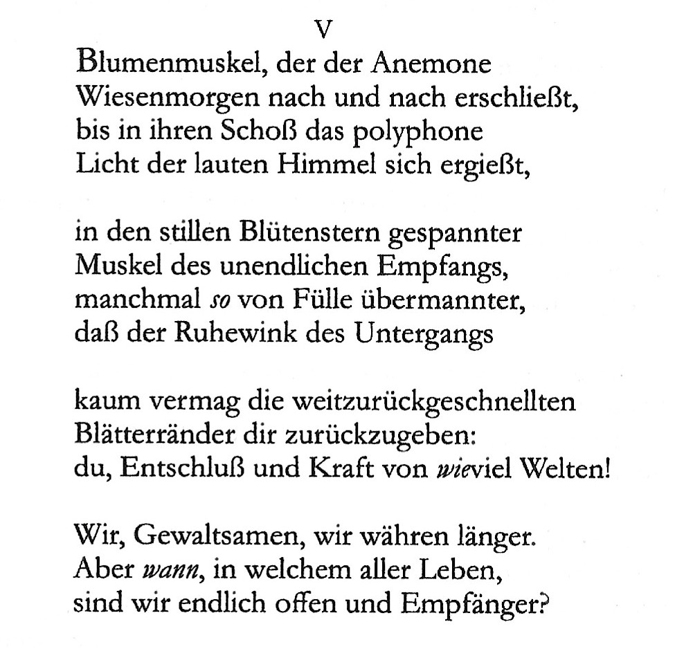 Sonet piąty, anemonowy (zawilcowy) otwiera triadę wierszy o kwiatach, w szóstym sonecie Rilke, poeta-ogrodnik, po raz kolejny w swej poezji przygląda się róży-królowej, w siódmym zaś kwiatom w ogóle – jako szczególnemu fenomenowi. W sonecie piątym mowa o istnieniu kwiatu jako istnieniu czystym. Kielich rozchyla się powoli: pełnia otwarcia to już pobliże zamierania, granica rozpadu. Znamy ten przepyszny Rilkeański temat ze słynnego Dinggedicht, zatytułowanego Das Rosen-Innere (Wnętrze róży) – pojawia się ów motyw w wyobraźni poety już w pierwszych latach XX wieku. (Anemon i róża rzeczywiście otwierają się podobnie).