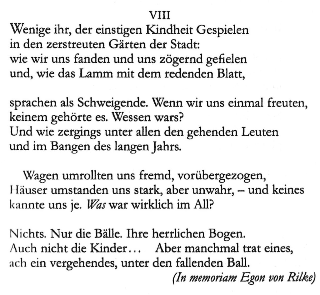Co znaczy akcent na „piłkę”? Akcent na reguły gry dziecięcej? Taka prostota, bezprzerzutniowa właśnie (choć pamiętamy, że w innych sonetach są łamania wersów, nieraz bardzo finezyjne), bezpretensjonalna w szyku, jest strictedziecięca. I tylko mimochodem wspomina się tu o śmierci dziecka, jak o niechcianym spalonym, jak o piłce, która z miejsca zabaw wytoczyła się na ruchliwą ulicę (i dziecko po nią nieostrożnie wybiegło…). Ale przecież to temu dziecku, towarzyszowi najbardziej beztroskich chwil w życiu, Rilke przypisuje sonet.
