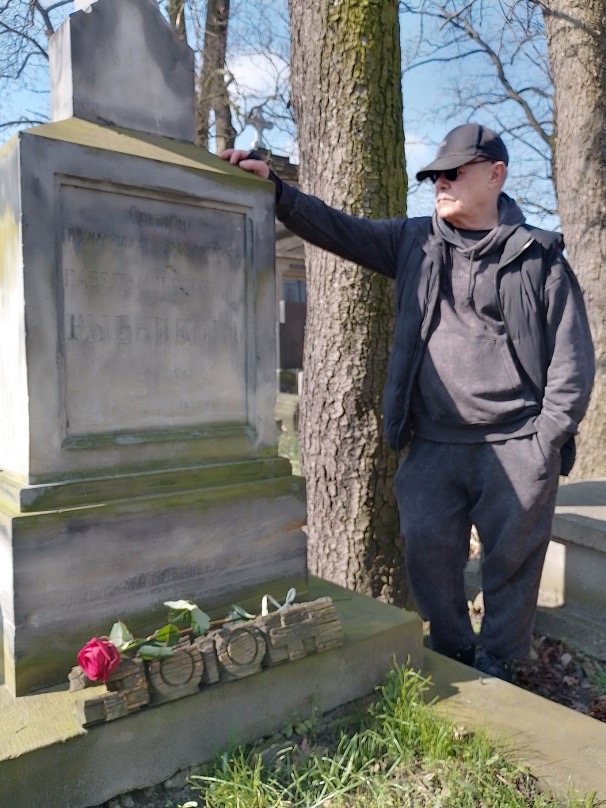 Jadąc do Kalisza, zastanawiałem się, kto nam zrobi zdjęcie do archiwum Towarzystwa Przyjaciół Rybnikowa, wszak to nie byle fota: wnuk na grobie dziada, słynnego rosyjskiego filologa i w dodatku ze mną, autorem tej byli. Z poprzednich odwiedzin zapamiętałem cmentarz prawosławny w Kaliszu jako zupełnie pusty, ale tym razem był… zamieszkany! Pod kamienną wiatą zbiorowej mogiły znalazło sobie przystań dwóch bomżów, czyli po polsku: bezdomnych. Nie tylko wyrwali się do zrobienia zdjęcia, ale żywo zainteresowali się, kto tam leży? A jak dowiedzieli się, że to pradziad Andrzeja, to poprosili o fotkę z nim na pamiątkę i zobowiązali się za dwadzieścia zeta przez cały rok sprzątać mogiłę Rybnikowa. Tyle wynosi roczne utrzymanie domowiny słynnego filologa w Polszy!