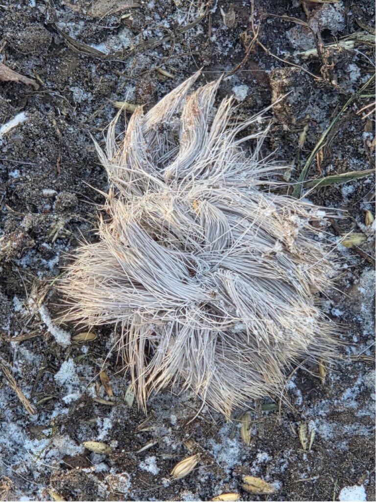 „Pukiel sierści, pozostawiony pod karmnikiem na pamiątkę przez sentymentalną sarenkę?”. Fot. Jan Zieliński, Opypy 2026