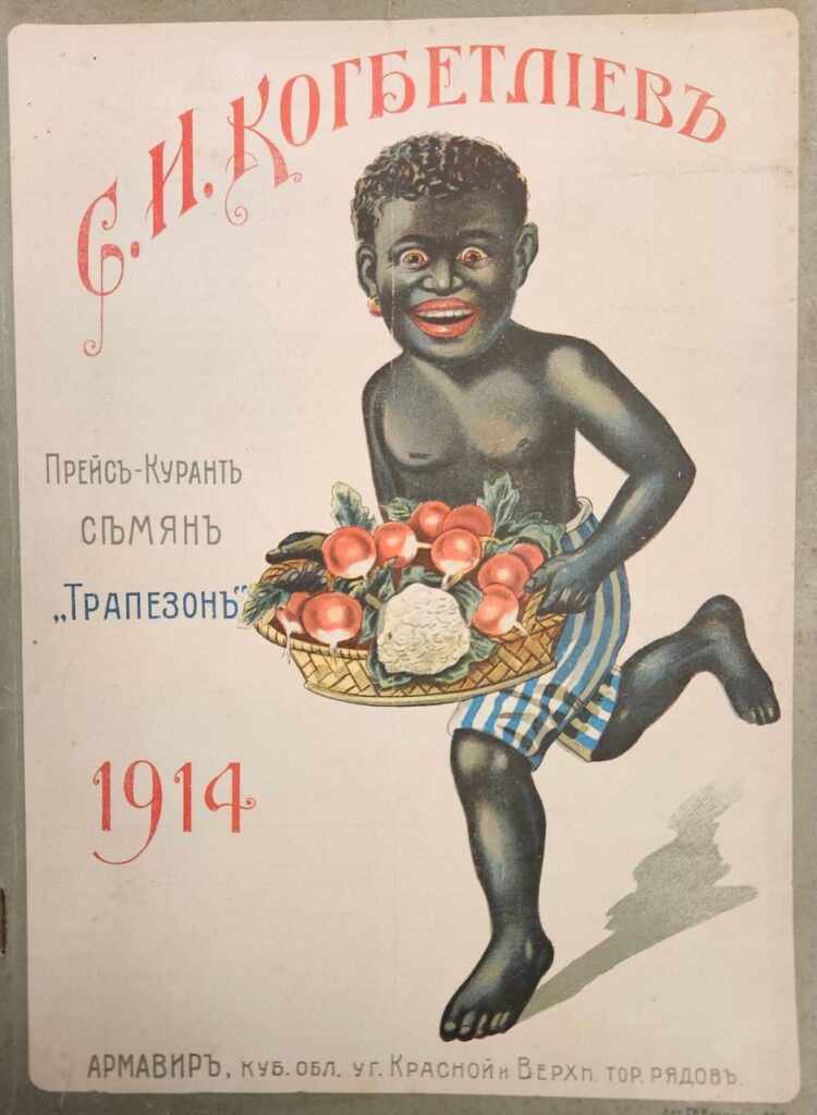 Ale cóż to za okładka! Skąd wziął się Murzynek, który biegnie z łubianym koszem pełnym kalafiorów i dorodnych rzodkiewek, w samych tylko – jest upalne lato w południowej guberni – portkach w marynarskie pasy, ale z materiału skrojonego w pion, a to odzienie wypisz wymaluj z któregoś z portów nad nieodległym morzem? Może to służący albo chłopiec na posyłki w wielkim kantorze Kogbietlijewa? Albo postać z opowieści, jakie Siemion Iwanowicz zapamiętał z dzieciństwa i zechciał właśnie, już mocno w latach, dać teraz na firmowym druku? A może po prostu wymyślona figura, by zatrzymać wzrok klienta? Co tam robił ten mały murzyński Hermes o zwróconej ku nam – nieostrożny, biegnie i ani spojrzy pod nogi – twarzy z odrysowanym jak z jakiejś rewii uśmiechem, z kolczykiem w uchu? Skąd i dokąd biegł – czy uliczkami między wygrzanymi białymi ścianami armawirskich domów, czy może przeciska się na targu (dom i firma Kogbietlijewa tuż-tuż przy miejskim targowisku), przez tłum miejscowych Ormian, Rosjan, Greków, sołdatów i kubańskich kozaków? Grafikę na okładkę katalogu nasion zlecił Kogbietlijew litografowi w Rostowie nad Donem, w znamienitej drukarni Grigorija Mojsewicza Puchowicza, który specjalizował się w nutach; nuty od Piechowicza trafiały i do największej polskiej księgarni w przedrewolucyjnym Kijowie, do Leona Idzikowskiego – i tu od razu ciągną się znane nam z lektur wątki z ziemiańskich i inteligenckich salonów Kijowa i Odessy czy Brodów, Kołomyi, Czernichowa i Stryja.